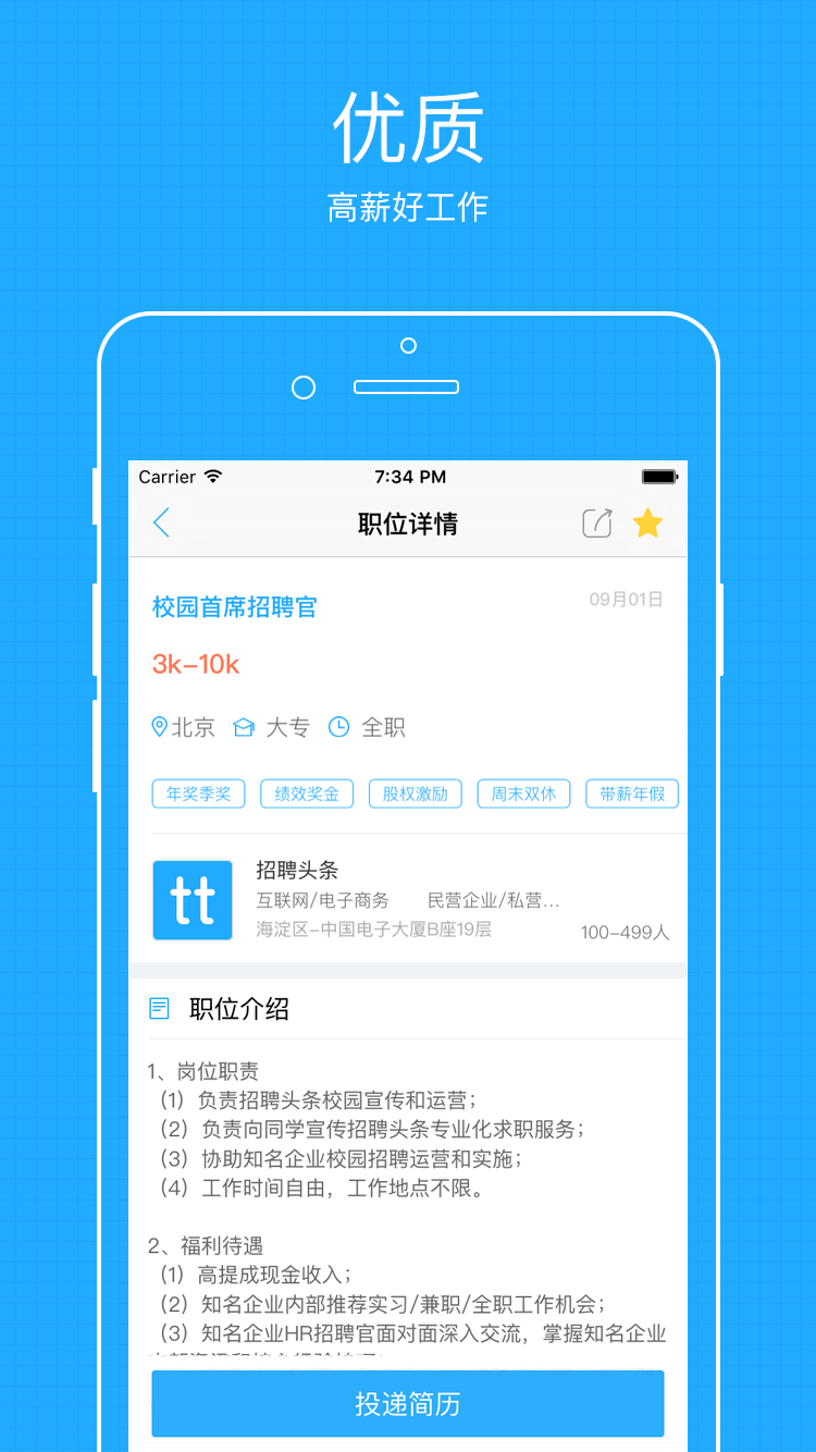 招聘头条,是国内校企合作覆盖范围广,服务内容专业的校园招聘服务商,由中国人力资源管理业界先驱与代表性人物彭剑锋教授担任全职首席顾问,华夏基石管理咨询集团提供专业支持,汇集数千家大型企事业单位招聘从业人员,为客户提供专业的校园招聘服务,包括网络招聘、RPO、人才评测,雇主品牌建设等人力资源专业化服务。【软件特点】