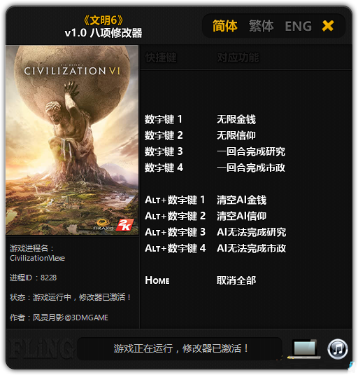 文明6修改器是一款非常强大的《文明6》游戏属性修改工具,文明6修改器支持对游戏中的金钱、信仰、移动力、生命等17种属性进行修改,让你拥有无限金钱、无限信仰、一回合完成研究等强大功能,帮助你成为千古一帝。