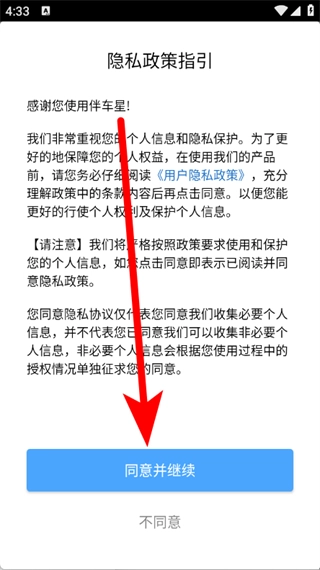 1. 开启伴车星,于隐私政策指引弹窗处,点击同意并继续。
