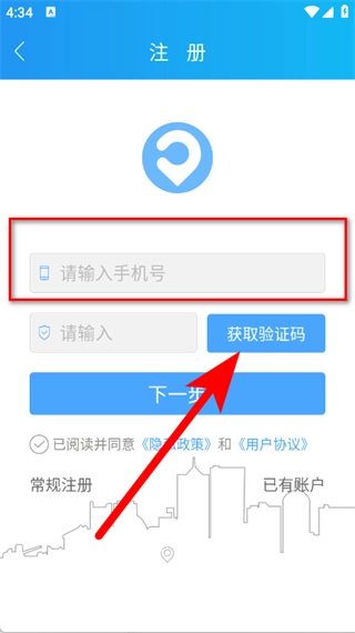 3、来到注册页面,填入手机号后,点击“获取验证码”。