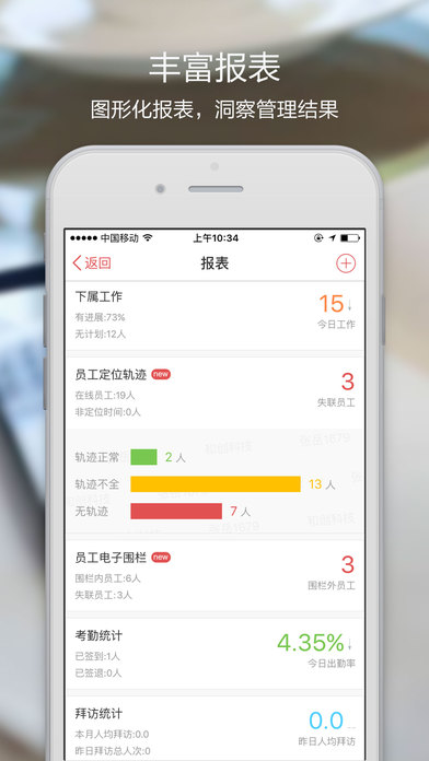 1.帮助您轻松管理团队工作红圈通,将日历和工作列表融为一体。在日历模式中,您可以直观的查看和规划您的所有工作(拜访、任务、会议和培训),时刻了解各项工作的最新进展,方便与同事保持实时协作;在列表模式中,您可以方便的查看所有工作的状态,按照时间顺序检查和复盘各项工作,保证重要工作不遗漏。