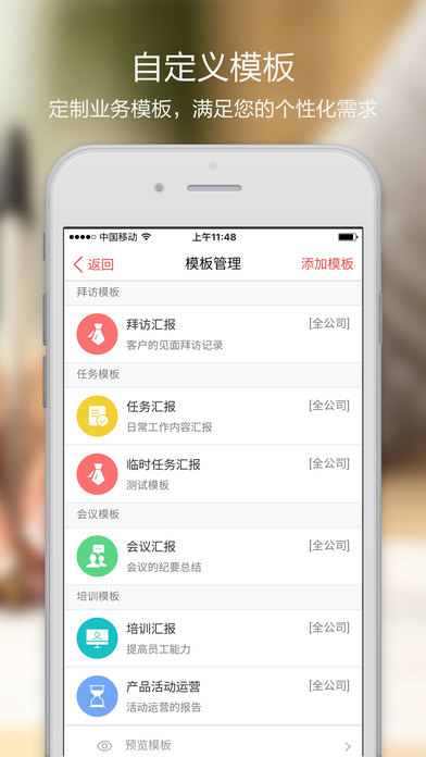 您可以根据实际业务自定义模板,让红圈通更加贴合您的团队。提供公告、考勤、审批、日志等简单易用的日常办公功能。同时,还可以使用手机设置您的企业。