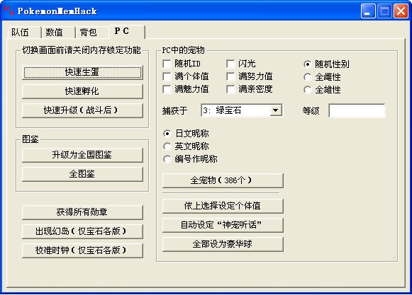 8. 关于[PC]选项卡中的“加入宠物到PC中”,该功能将改写PC中前386个宠物,而第13页的最后4个和第14页的全部将不会被改动。