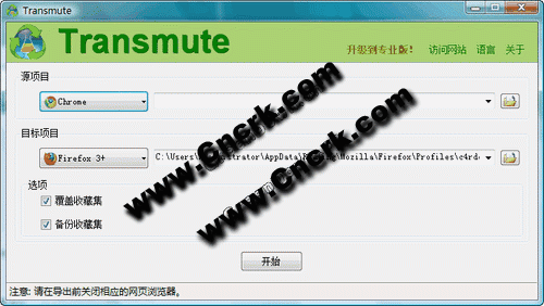 Transmute可以帮助用户在各个浏览器之间快速便捷进行书签的相互导入/导出,其支持当前主流独立核心浏览器,包括最新的Google Chrome、Mozilla Firefox 3 和 Opera。相互间导入导出的书签可以集合为一体,而不是覆盖原有的旧书签文件。