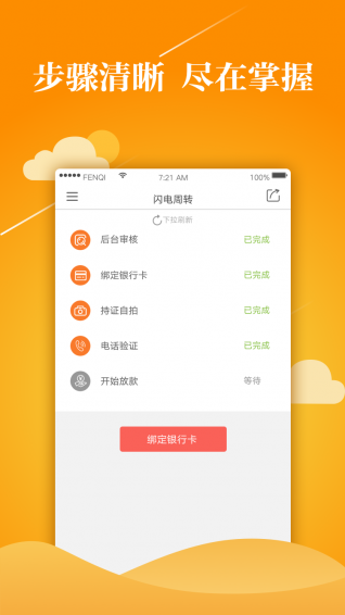 1. 简单资料:只需提供您真实的身份信息、和手机号;2. 步骤清晰:流畅的APP操作体验,随时掌握当前步骤进展;