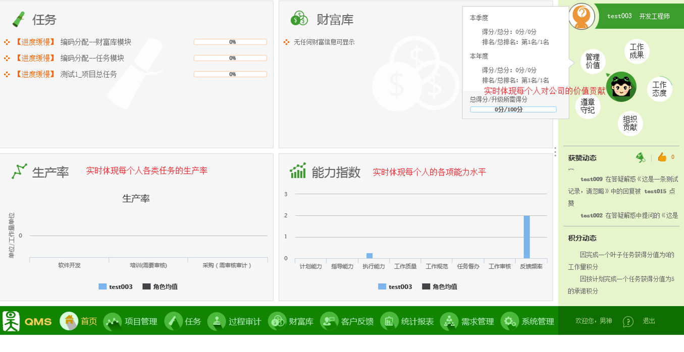 企业量化管理系统是用于对项目、任务、商务、人事、客户反馈、知识等公司运营的各方面进行有效管理,并使用积分客观、公正的评价工作过程及成果的管理系统。