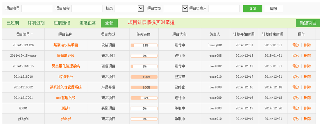 项目管理:对各类项目按进展情况分类管理,项目信息、项目进度、利润预算、合同信息、审批记录、变更记录、项目文档、项目成本等简单明了,总览各项目的情况。
