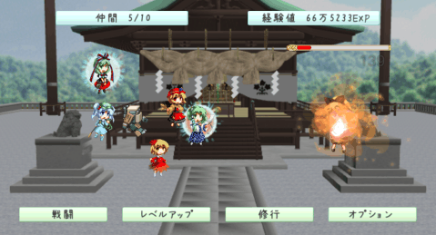 东方红防录同类游戏,一样简单的界面。分为战斗、升级、修行、设定四个部分。战斗部分,人物会自动战斗,战胜敌人会获得经验,经验可以用来升级人物和解锁新的人物。修行有一定成功率,成功可以获得一定经验,修行中的人物无法参与战斗。来一起解锁东方里的妹子们吧!