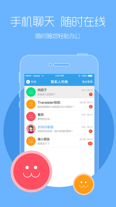1、随时在线-随时收发消息,及时响应买家咨询,节假日生意不打烊。2、处理售后-增加售后入口,及时处理买家售后申请,提高工作效率。