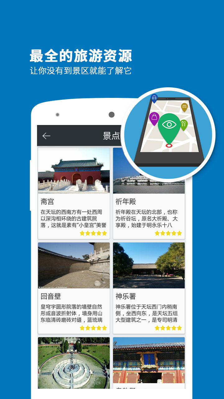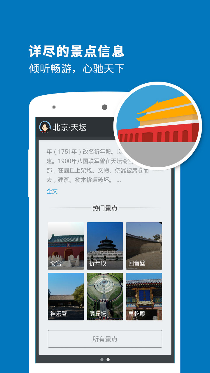 听游天下——天坛导游:专业的智能语音导游系统,专为喜欢自由行的旅行爱好者而设计。携手科大讯飞,带给您独特的天坛印象。天坛,是明清两代皇帝每年祭天和祈祷五谷丰收的地方;是中国保存下来的最大祭坛建筑群。天坛,皇家祭天圣地,至今摆放其中的祭天物品到底有何用处,祭天大典由哪些步骤组成,什么时候能看到祭天大典?