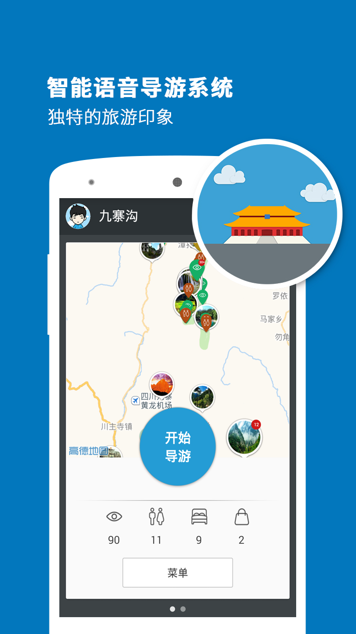 1.自动定位为您播报每个景点的历史及含义2.提供景区内旅游路线