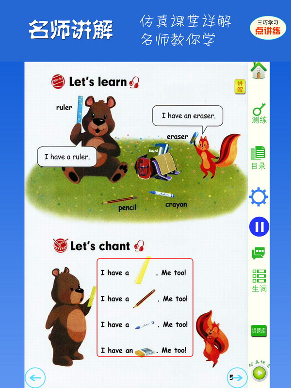 1. 强大的点读机:课文全文点读。朗诵者为外籍播音员,语音纯正。课本上所有的内容字均可点读发声:字母、单词、句子,对话、文章。2. 名师讲解: 新东方名师倾情讲解,每课讲解重点包括:课文解读、单词运用、语法、练习答案。