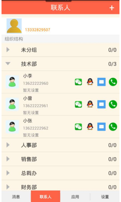 更方管理企业内部或外部任何联系人信息,将qq、微信、短信、短号、电话等交流软件集成在联系人页面就可以直接打开找到QQ的交谈窗口;微信窗口;短信窗口;内部短号沟通窗口;电话沟通窗口,不需要切换各种交谈软件。