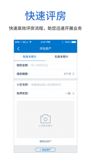 【快速评房】:填写资料,上传房本照片,快速、高效率的评房流程助您迅速开展业务。【返点计算】:保证收益真实透明,填写相关资料计算返点,百万薪金触手可及!