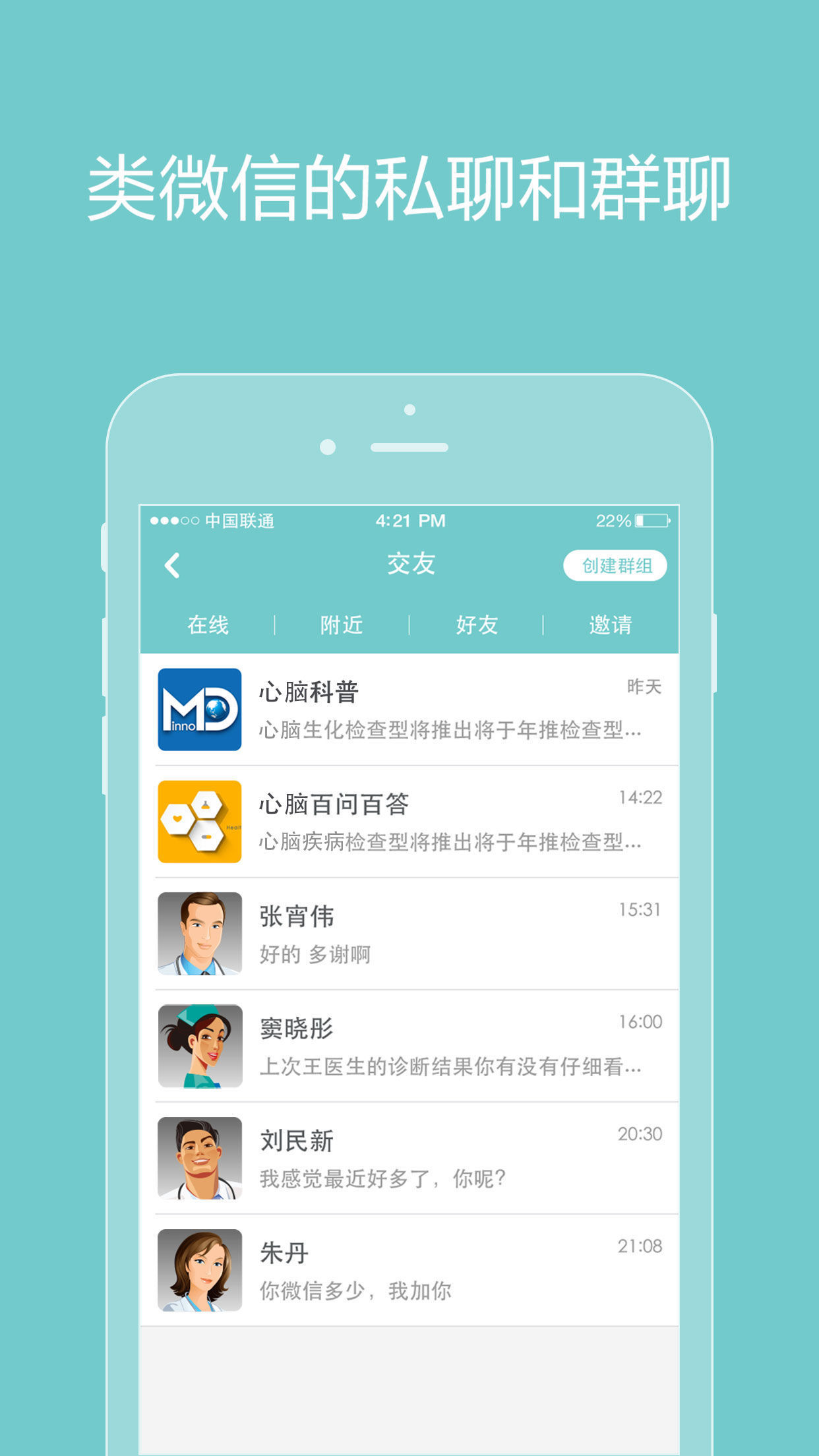 3.类微信交友功能,与医生和患者建立好友关系,私聊和群聊