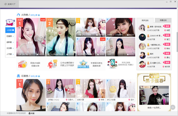齐齐互动视频是2014年重磅推出的一个娱乐竞技视频直播平台,为腾讯用户与互联网民提供互动娱乐与视频直播服务。目前,齐齐互动视频上已汇聚海量草根明星与有着明星梦想的普通大众,可以直播演艺、参与娱乐竞技活动等方式展示自己,这里已经成为梦想展示舞台。网民则可通过点歌、聊天、赠送虚拟礼物等方式与草根明星的主播实时互动,实现与平民偶像的近距离交流。