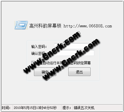 软件功能: 1、锁定电脑屏幕,禁止键盘任何热键操作; 2、支持开机自动运行,防止重启重新操作; 3、自我保护力强,防止终结; 4、遇到非法5次暴力或者5次密码错误自动执行关机操作