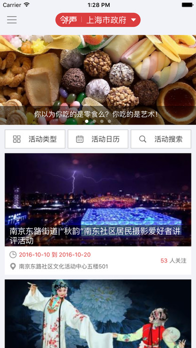 民生公益活动的预告、展示、点评平台。活动板块收纳全年8万场活动,通过LBS功能,精准推送给社区居民。活动板块还将不定期开展抢票活动,带你免费玩转上海。