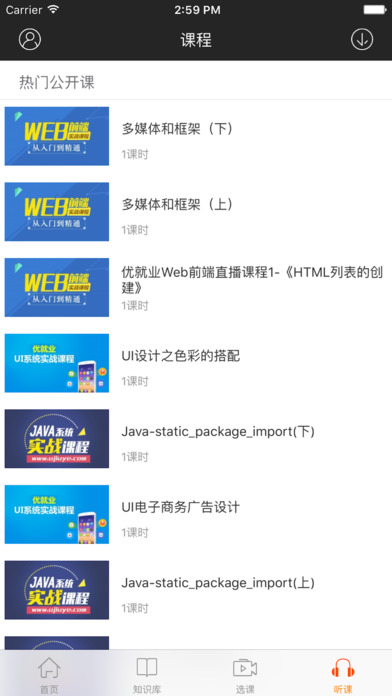 3.听课:让您在家享受到一对一的授课待遇,课件离线观看,充分利用碎片化的时间进行充电,下一次名企offer只属于您。