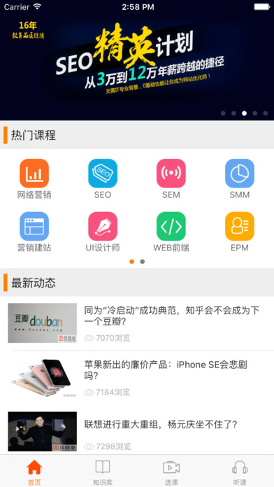 1.知识库:容纳行业内的最新信息,让您能够第一时间了解到最新的知识体系,为您的互联网之路披荆斩棘。2.课程:海量优质的网络课程,让您随时随地享受与名师的零距离沟通,课程包含互联网五大热区,不管你想转行还是想创业,一定有一款适合您。