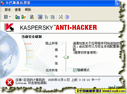 卡巴斯基反黑客防火墙纯净汉化版 v1.94 +Key2007-9-3 Kaspersky Anti-Hacker 是Kaspersky 公司出品的一款非常优秀的网络安全防火墙!和著名的杀毒软件 AVP是同一个公司的作品!保护你的电脑不被黑客攻击和入侵,全方位保护你的数据安全!所有网络资料存取的动作都会经由它对您产生提示,存取动作是否放行,都由您来决定,能够抵挡来自于内部网络或网际网络的黑客攻击!