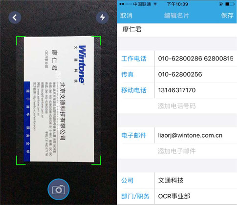文通名片识别SDK可支持Android、iOS主流移动操作系统,APP集成名片识别SDK后,用户采用手机、平板电脑对名片进行拍摄即可自动识别名片信息;