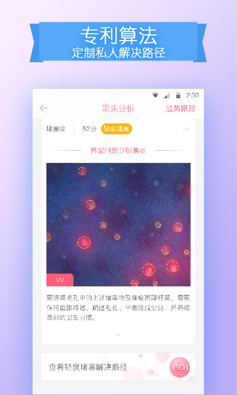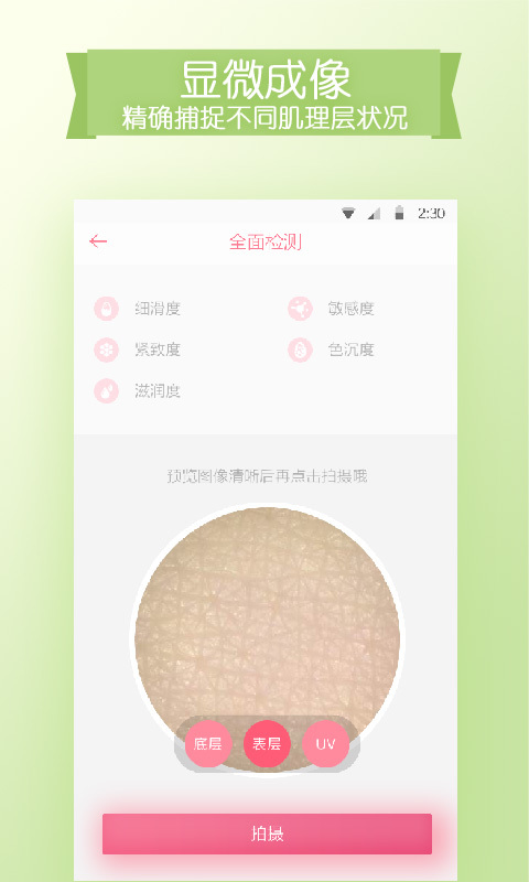 2、护肤建议:根据表层、底层、UV三个肌理层检测数据,定制护肤方案。