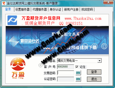 万盈期货模拟交易系统是本公司开发的一款完全免费的期货开户模拟交易软件,纯绿色无插件系统解 压就可以使用,无需安装。使用本软件可以不花一分钱就能练习炒期货。开盘时间免费注册和使用,注册模拟账户不需要填写真实客户资料,模拟账户的手续费标准比真正的 标准要高很多,如果需要开设真正的账户请联系我们