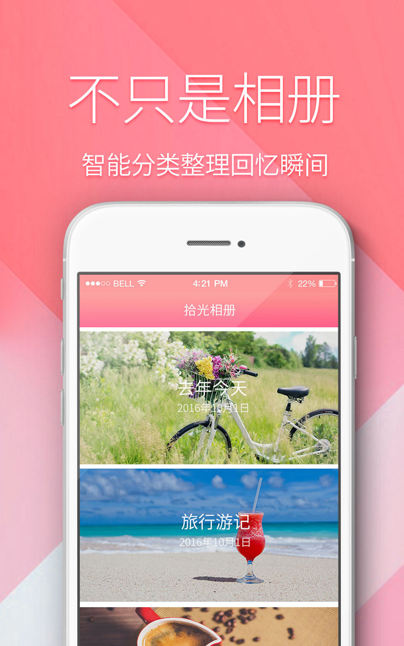 1、有了拾光相册,你可以轻松浏览回忆的瞬间,像过电影般欣赏旧时光记忆。最美的回忆,尽在拾光相册。2、[智能照片整理]一键打造你的专属回忆相册,无需耗费时间手动整理,拾光相册帮你智能分类,按照时间、地点、人物自动分类并让你拾起过去的美好回忆。