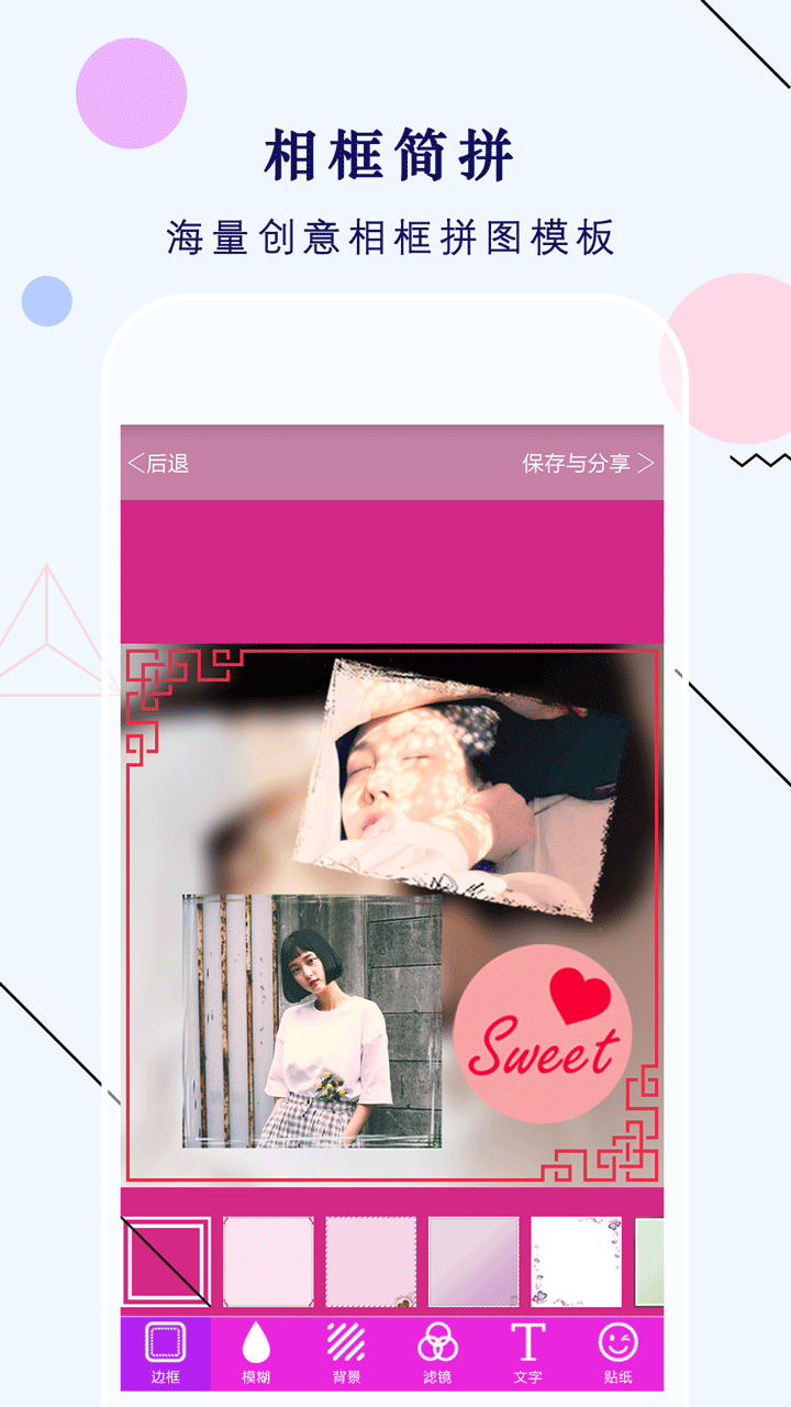 【边框贴纸】添加多款简约清新相框,可以使用各种超萌艺术贴图,玩法多样,创意DIY