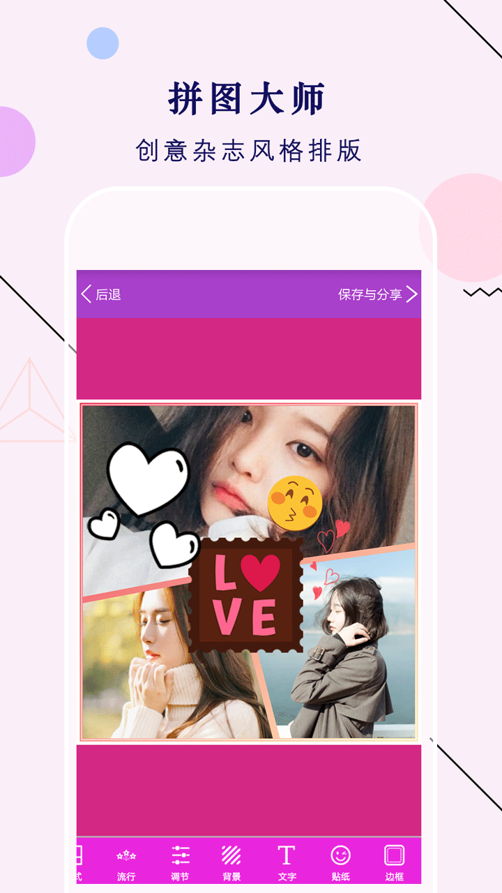 简单实用的智能画中画拼图编辑器,超好玩的相片组合工厂 创意画中画泼彩、简拼、美图文字、滤镜修图、艺术贴纸......【软件特色】
