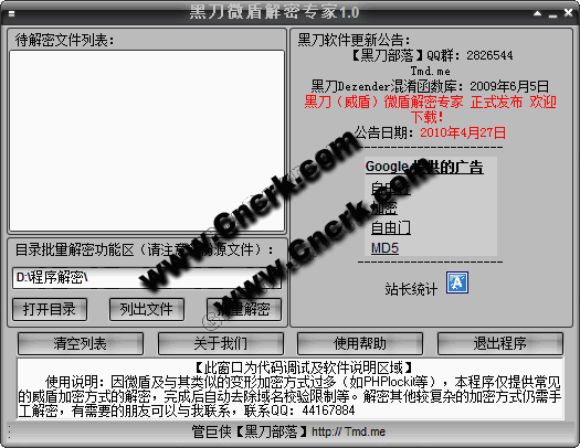 黑刀微盾解密专家 因微盾及与其类似的变形加密方式过多(如PHPlockit等),本程序仅提供常见的威盾加密方式的解密,完成后自动去除域名校验限制等。