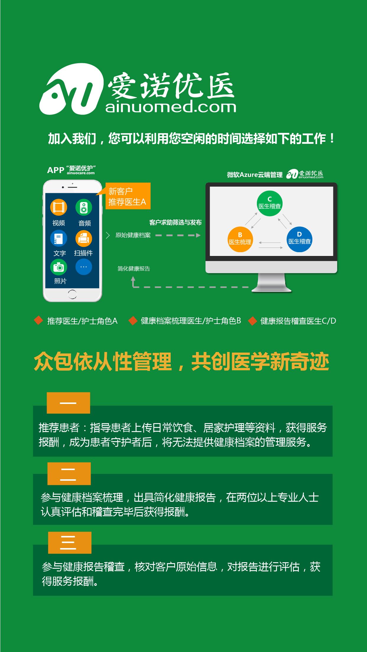 全球首款,中国独有,专业的依从性管理众包平台,爱诺优医邀您共创医学新奇迹。您只需要加入我们,利用您的空闲时间,通过与来自全国的医疗专业人士的众包协作,共同解决依从性管理的难题。共建“诊疗观念—处方/护理-实践数据-观念更新”的生态体系,您和您的团队,将收获诸多的权益。【平台优势】