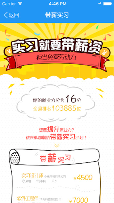 进入带薪实习页面,显示你的就业力分数及全国排名位数。点击立即加入按钮,在现实精准就业页面前,需要先完善卡牌信息;