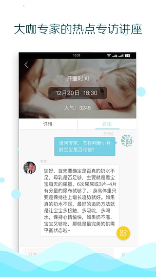 每月多期在线公开课和专家访谈,邀请哺乳、早教、儿保、睡眠、心理、营养等等各领域专家,为你传授最专业实用的知识,并在线答疑,让你更好的育儿。