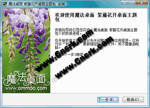 魔法桌面原创紫藤花主题,用绿色为背景,用紫藤花作装饰,造型优美,垂着的花下还能隐隐听见情人在私语哦