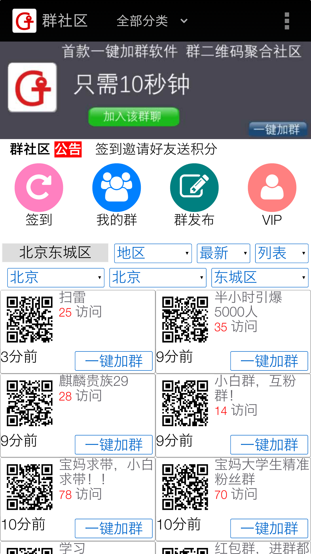 【一键加群】在群二维码页面或群列表页面,都可以找到一键加群按键,点击即可自动加群。