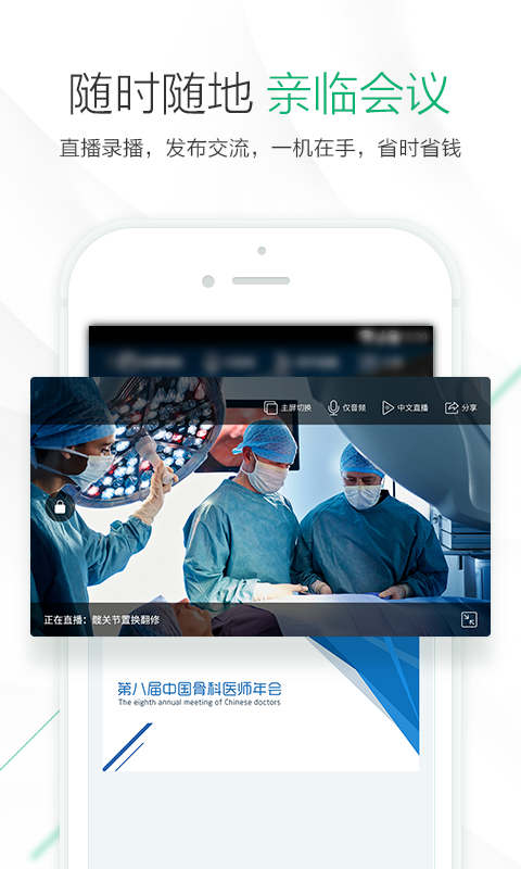 不用出差,聆听百余场大型骨科学术会议直播录播,卫星会发布,会前预热及会议推广,小型线上会议在线交流,一机在手,省时省力。