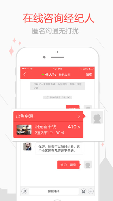 在线聊天工具,随时随地匿名与经纪人收发文字、语音、表情、图片、位置、收藏的房源等信息进行沟通,为您保护隐私免受不必要的打扰。