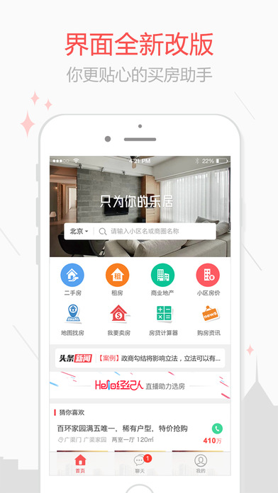 便捷易用的个性化找房体验,定位查找附近优质房源、二手房、租房、小区、房价等多种选房维度随心切换、房源搜索结果匹配买房需求智能排序展示。