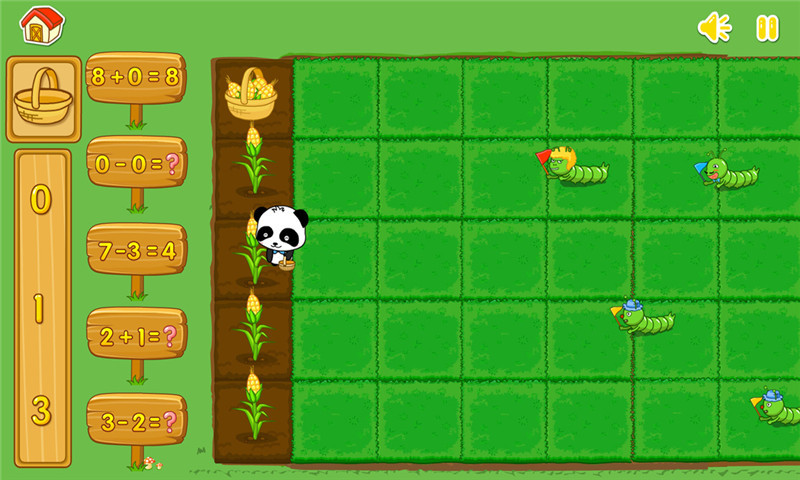 啊哈,帮助熊猫种菜的过程中,答对算式就会相应地获得一个杀虫剂,就可以把可恶的毛毛虫,赶出菜园子。但是要是一直没有答对算式,毛毛虫就会占领菜地哦!?