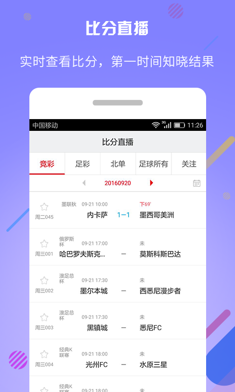 比分直播:实时提供竞彩,足彩,北单,足球赛事比分直播,提供多种玩法多维度分析,历史比分彩果,未来赛程,一键获取;