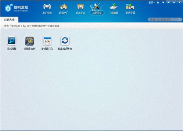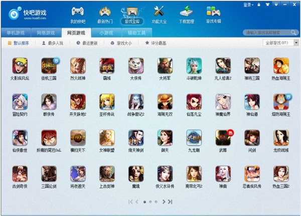 快吧游戏是一款简单易用的游戏管理软件,提供了数千款热门的单机游戏,点击即可玩,为用户省去了找游戏、下载、安装等繁琐的步骤!所有游戏都经过人工以及多重权威杀毒软件层层检测筛选,确保无病毒无插件。内置海量游戏,单机、网游、页游、小游戏不断更新,不必到处找游戏。只需轻松一点,实现游戏的下载、安装、运行,减少用户麻烦,节省玩家时间。