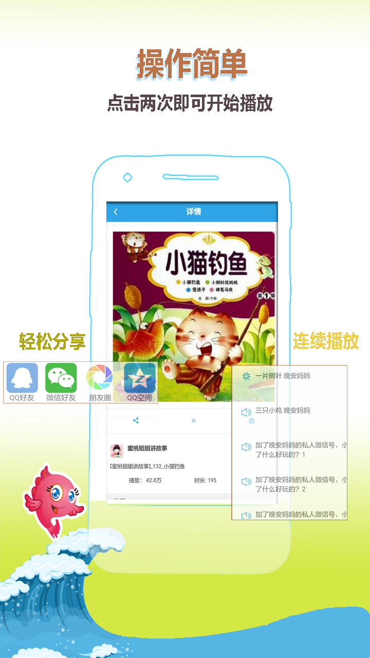 儿歌大全:兔小贝儿歌,亲宝儿歌,六一网儿歌,小马宝丽,小蝌蚪找妈妈, 拔萝卜儿童故事:睡前故事、公主故事,芭比,凯叔讲故事,晚安妈妈,小白兔绘本故事:不一样的卡梅拉,迪士尼公主,小黑鱼,花婆婆英语故事:小王子,松涛叔叔叫你起床了国学板块:三字经,三十六计,弟子规