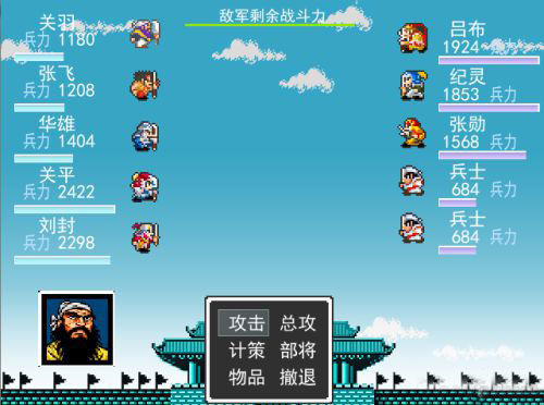 这一章兵士数非常重要,要多买些补充兵士的道具,「吕布」一加入上场战斗的队伍中,就没有办法叫他离开了,要注意!