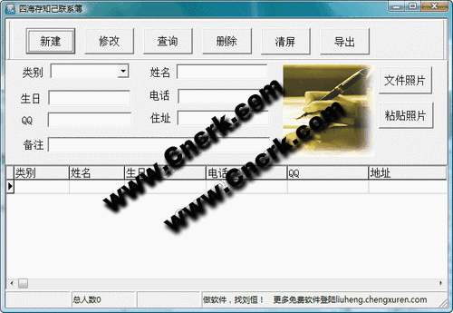 这个软件方便查询熟人的联系方式,这里包括姓名、电话、地址、QQ、备注等项目,而且可以把熟人的照片附上。操作上有新增人员、修改人员信息、删除人员、查找人员和导出为excel。初始登录密码为:123456
