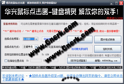 博百优鼠标点击器 V7.0 简体中文绿色免费版 保护你的鼠标,解放你的双手!【博百优鼠标点击器】是一款鼠标辅助工具。无需设置脚本就可模拟手工鼠标点击动作,只要按下“F3”键,自动完成鼠标点击,鼠标指着哪里,就会一直按着哪里!“F4”键则是停止点击。本软件可显示鼠标的精确坐标位置,可勾选是否在指定的鼠标坐标位置点击,可以随意设置鼠标点击频率(可以自定义点击频率,比如可以设置点击频率为0.1毫秒!),还可最小化至系统托盘。灵活简单的点击设置让您从此轻松的从重复繁杂的鼠标点击中解脱出来