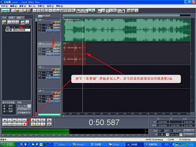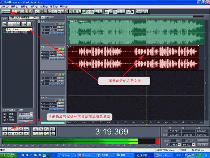 (注)需要先说明一下的是:录制时要关闭音箱,通过耳机来听伴奏,跟着伴奏进行演唱和录音,录制前,一定要调节好你的总音量及麦克音量,这点至关重要!麦克的音量最好不要超过总音量大小,略小一些为佳,因为如果麦克音量过大,会导致录出的波形成了方波,这种波形的声音是失真的,这样的波形也是无用的,无论你水平多么高超,也不可能处理出令人满意的结果的。