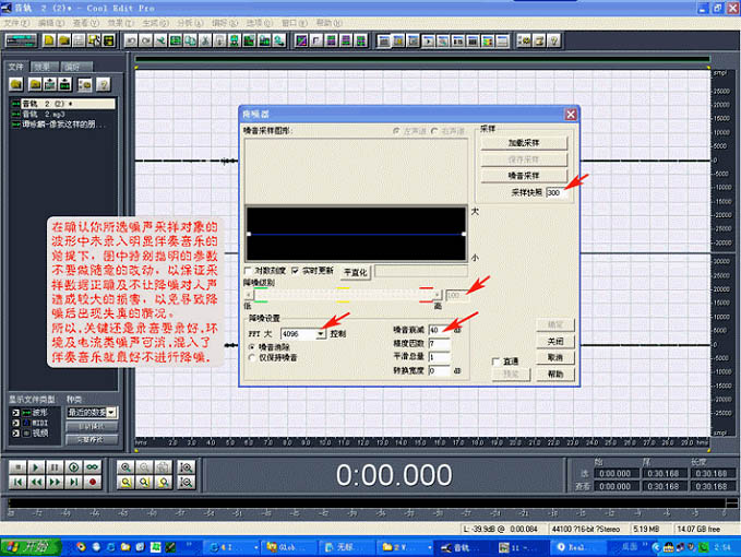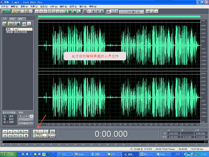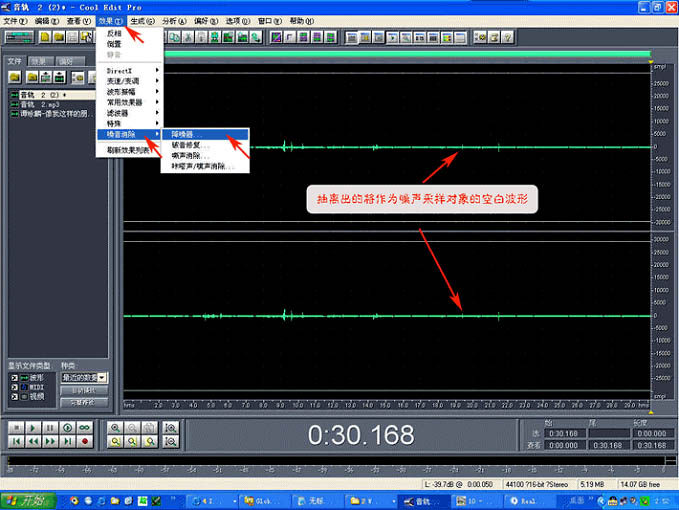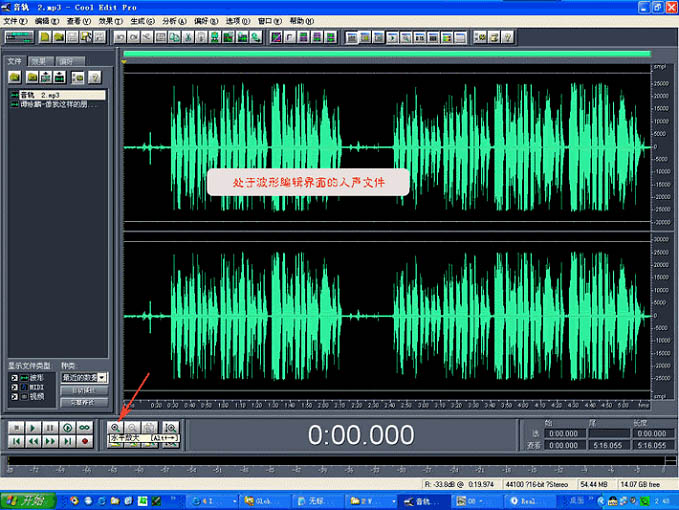 1.点击左下方的波形水平放大按钮(带+号的两个分别为水平放大和垂直放大)放大波形,以找出一段适合用来作噪声采样波形。