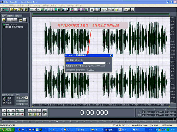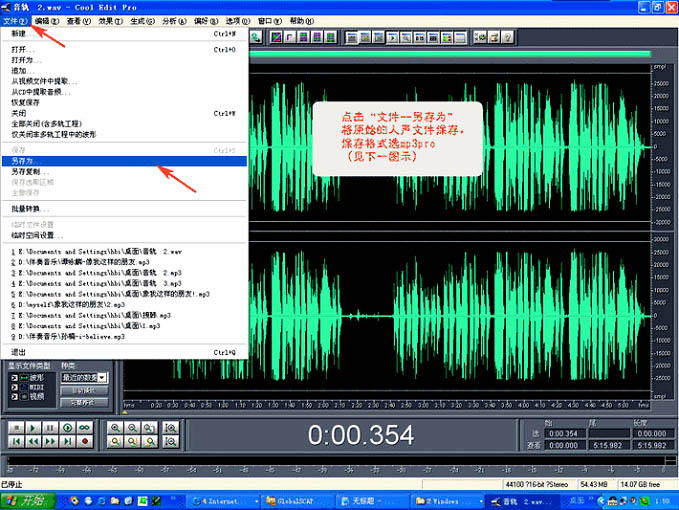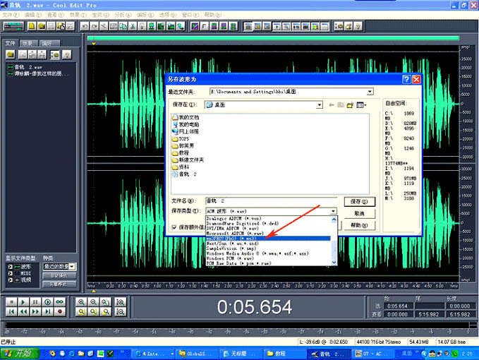 5、双击音轨2进入波形編辑界面(图5),将你录制的原始人声文件保存为mp3pro格式,以前的介绍中是让大家存为wav格式,其实wma/mp3也是绝对可以的,并且可以节省大量空间。